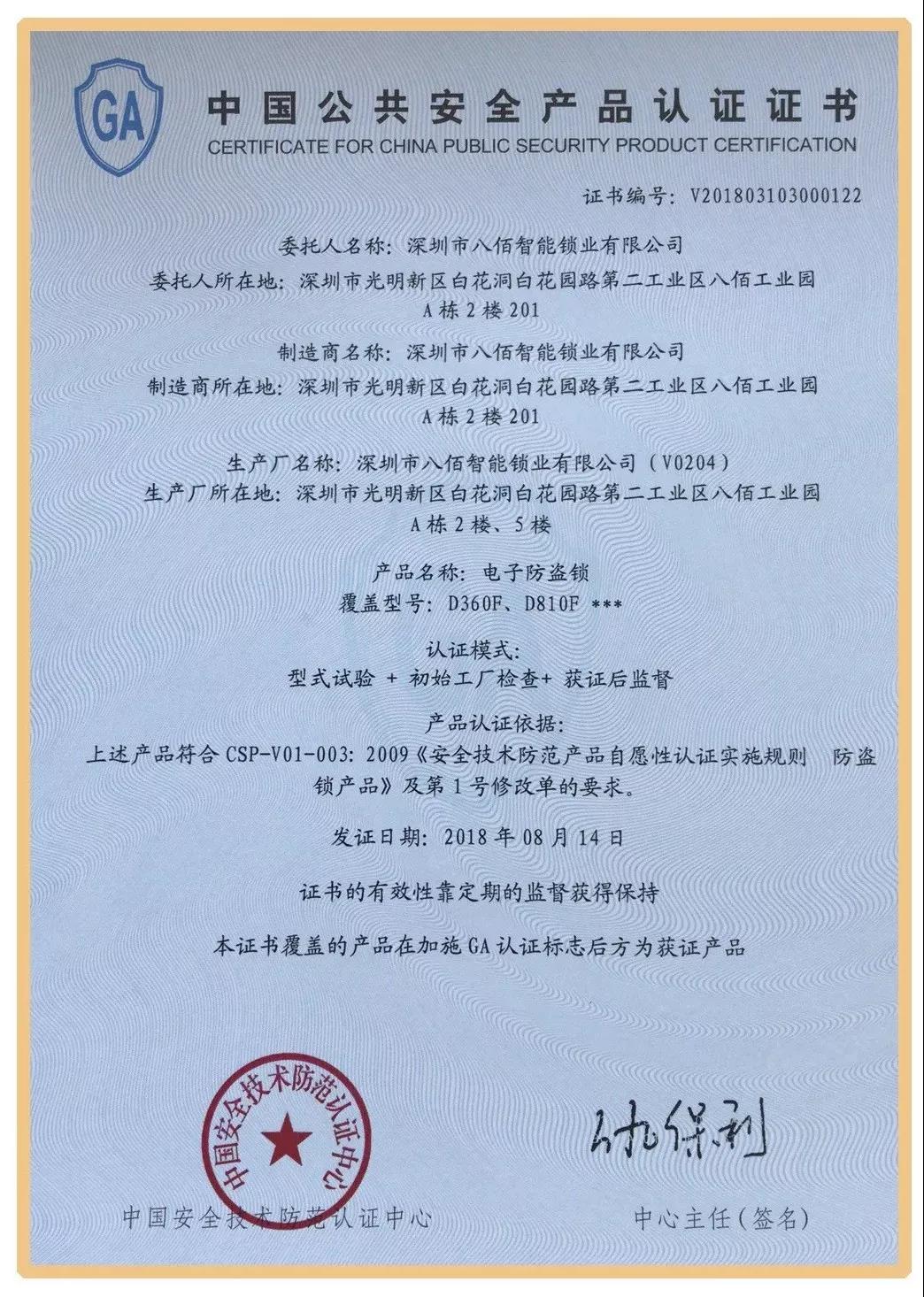 重磅喜訊|八佰智能鎖業(yè)榮獲“中國公共安全產(chǎn)品認(rèn)證證書”